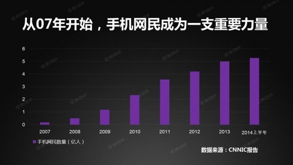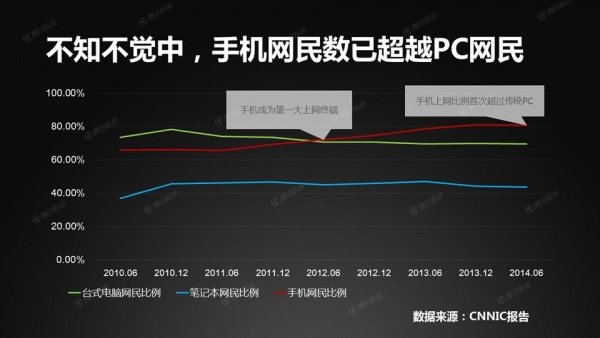 随着智能手机的普及,手机网民的地位日益提高。2012年,手机超越台式机,成为第一大上网终端。2014年7月,手机网民数量超越PC网民数量。