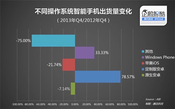 答案也许出乎你的意料。当我们对比2013年底和2012年底的智能手机出货数据时惊讶的发现,谷歌安卓、苹果iOS的市场份额都在下降——而偷走市场空间的,正是那些基于谷歌安卓而衍生出来的定制版安卓系统。