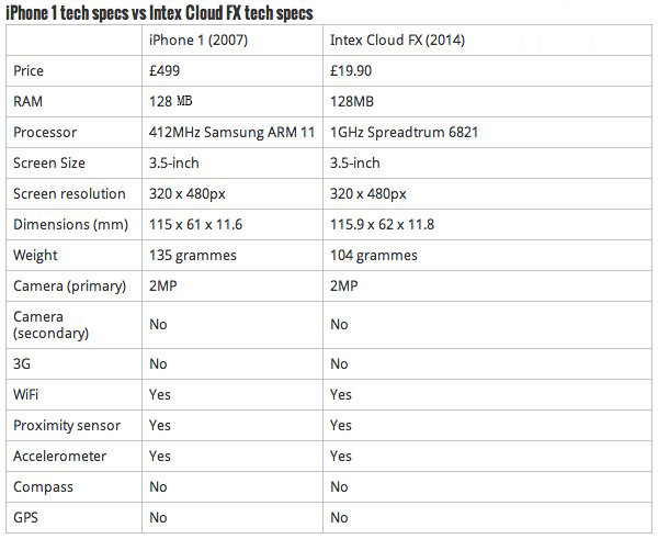 Intex Cloud FX发布后不久,Phone Cruncher便意识到这款手机的配置有些熟悉,这是因为其配置几乎与苹果2007年推出的第一代iPhone的配置相同:从ARM大小到显示屏尺寸再到显示屏分辨率,这些配置似乎直接取自苹果第一代iPhone。