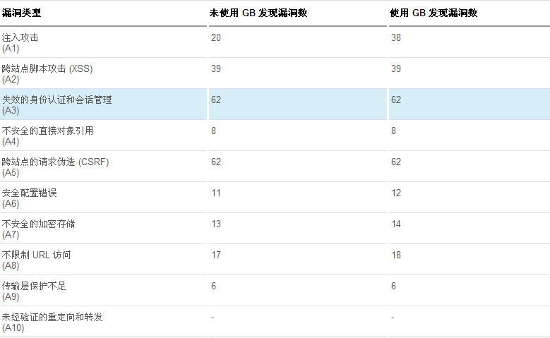 Glass Box 通过搜集服务端信息,可减少误报率,增强 AppScan 对各种漏洞类型的检测,主要能够增强 AppScan 对注入攻击、不安全的直接对象引用、安全配置错误和不安全的加密存储等漏洞的检测。通过扫描 AltoroJ 项目可以发现,配置 Glass Box 前,共扫描出了 100 个漏洞;而配置 Glass Box 后,共扫描到了 139 个漏洞;Glass Box 增加了了大约 40% 的漏洞扫描发现数量。下表是按照 OWASP Top 10 漏洞分类方法,对使用 Glass Box 前后的扫描漏洞数量进行的对比。