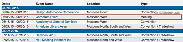据外媒Macrumors报道称,参照旧金山Moscone Center会议中心2015年行程安排来看(如下图),苹果2015 WWDC全球开发者大会则安排在6月8日至6月12日召开。