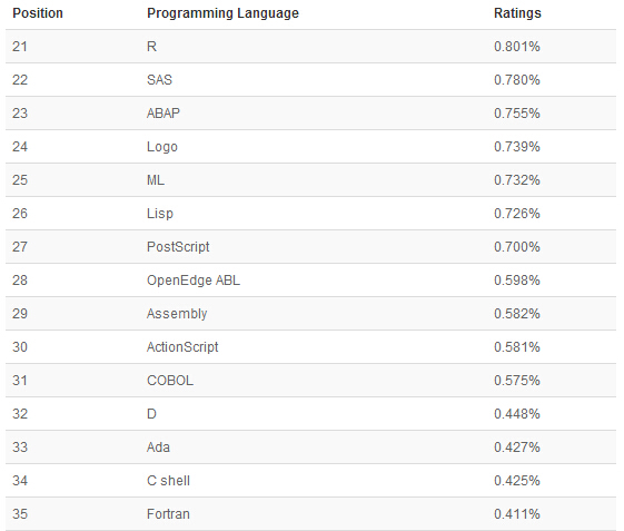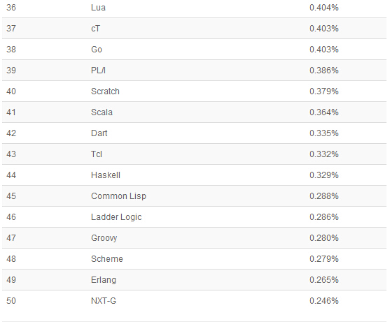 对于这一趋势,笔者理解的是,编程语言不断推陈出新,花样繁多,再加之各大科技巨头积极推广自身推出的语言,比如苹果的Swift(这个月排名第18位)、谷歌的Go等等;使其在使用领域方面有所限制。此外,一些特别领域使用编程语言也有所讲究,比如,生物学、统计学、硬件以及心理学等。
