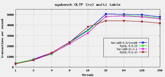 如果没有正确的编写代码将会得到一个共同的结果,即在用8到16个线程的开始你想看到好的结果,但在这些线程运行之后你不会看到你期望的结果。你将会看到这个问题,这意味这可能是算法问题。(这也不是超线程或是硬件线程造成的)这是我们在这里看到MySQL 基准的问题。对于我来说,这是MySQL规模化产生问题的迹象,这也是令人担心的原因之一。MariaDB在同样的基准中也有一些小问题,但是比MySQL要轻微的多,只能说是勉强吧;我推测这个问题在并行计算中可能不会出现。