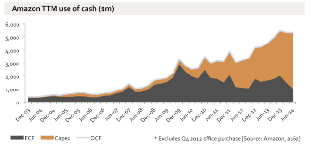 亚马逊几乎把赚到的每一分钱都重新投入到企业经营中,这可以从该公司的资本开支增长中看出: