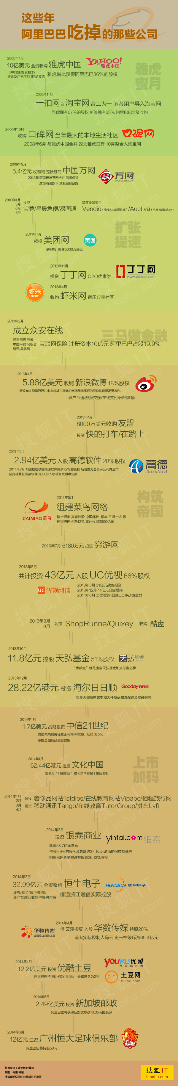 阿里巴巴(Alibaba)即将在美国上市(股票代码:BABA),在近一年,阿里巴巴也做出了一系列的入股和收购,整合成为了业界巨头之一。以下是搜狐IT整理的信息图,展示那些年,被阿里巴巴“吃掉”的那些公司: