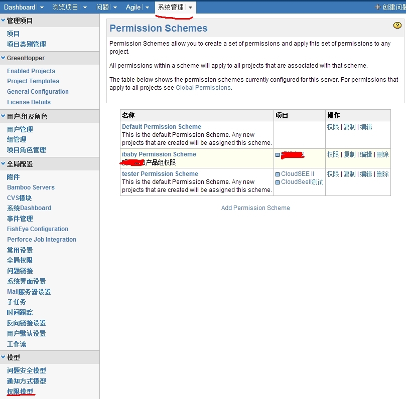 打开系统管理中的权限模型我们可以看到现在有系统默认的权限模型和我自定义的两个权限模型(建议自建权限模型时采用复制默认模型的方法然后进行更改)