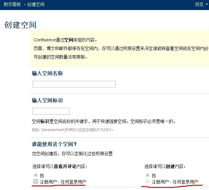 创建一个空间,标红的地方本来是默认选中的,我们不选它们,以便之后的隔离权限。