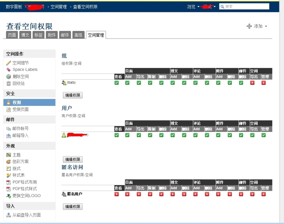 创建空间后管理员可以进入相应空间的空间管理界面进行权限设置,比如这里除管理员外我只给ibaby组用户分配关于此产品空间的权限。