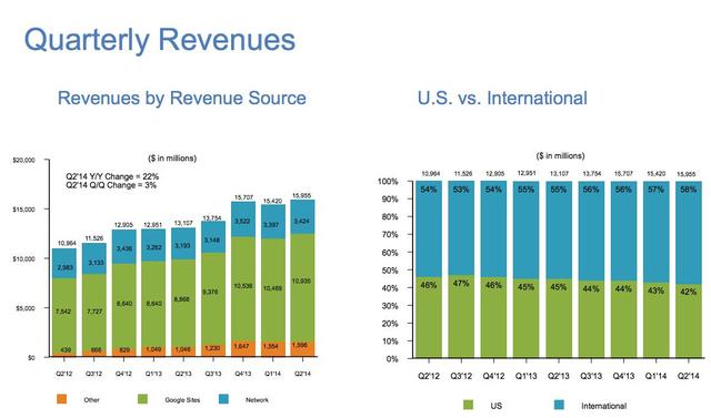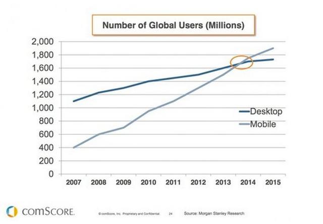 如果你还是想对谷歌表示一下担忧,下面两个图表可以为你找些理由。首先,下图所展示的是,谷歌的桌面用户及移动用户的增长情况。从图中可以看出,今年,移动用户增长超过了桌面用户。