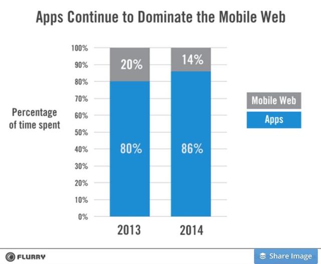 从另一张图,如下,可以看出,相较于移动网页,越来越多的移动用户倾向于通过应用程序接入互联网。