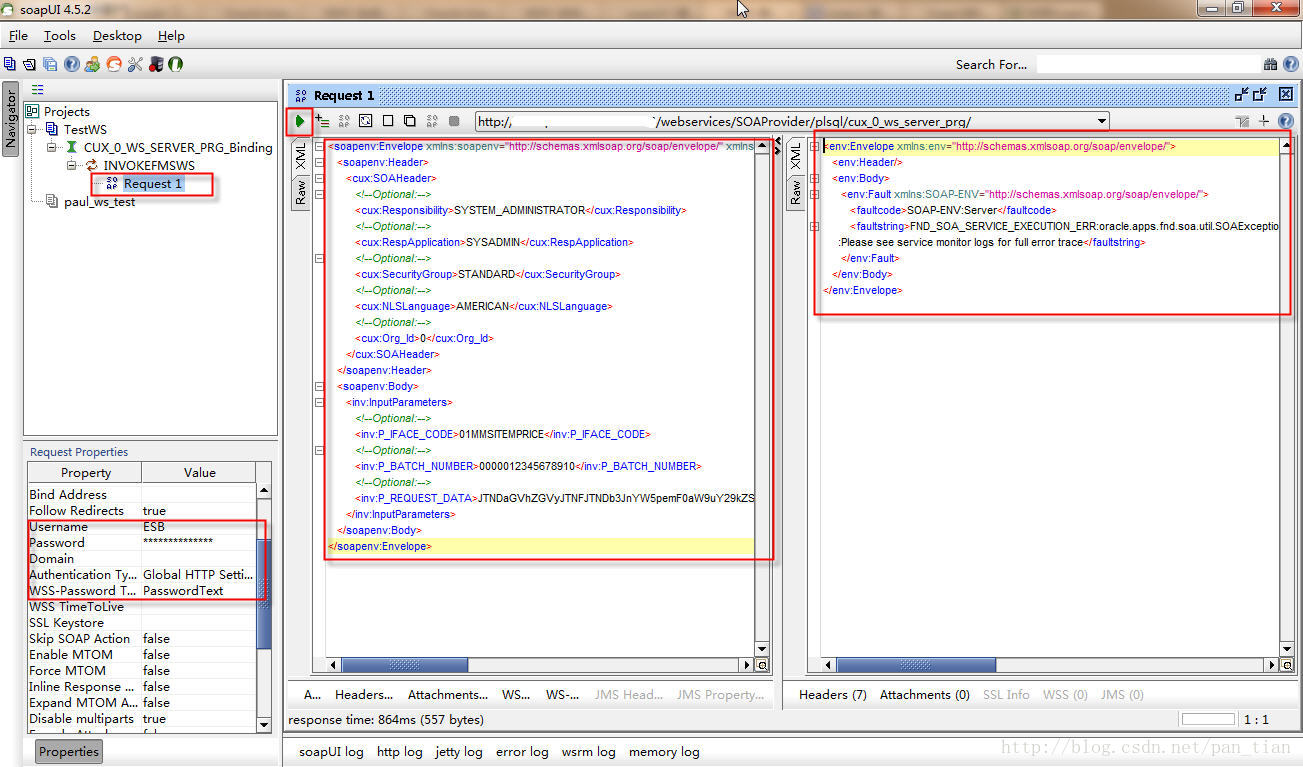 Project建立好后,SoapUI会根据WSDL的格式生成左边的列表树,包括CUX_0_WS_SERVER_PRG_Binding为WSDL Binding,INVOKEFMSWS为Binding中的Operation。双击Request1能看到Soap请求报文的内容。