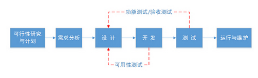 软件生存周期模型,把软件生存的漫长周期依次划分为:可行性研究与计划、需求分析、设计、开发、测试、运行与维护六个阶段。在这其中,设计阶段包括UED,而开发和测试阶段对应有测试的过程,如开发过程中的可用性测试、单元测试、集成测试等。另外,开发过程中的多次可用性测试的过程也是连接前期UED和后期功能测试和验收测试的关节点,前后都有很多相似之处。而后期的用户验收测试则从另外的一个角度连接了UED和测试,验收测试的反馈会影响UED阶段的进一步修改。在设计--测试--修改这个反复循环的迭代开发流程中,可用性测试以及验收测试都可以为结束迭代的循环过程提供可量化的指标。