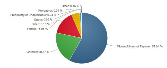 根据Net Market Share的8月新统计数据显示,全球浏览器市场中IE浏览器仍然占据着霸主地位,其中IE8市场份额继续由七月份的21.25%上涨至21.4%,而IE11也小幅上涨,份额从17.54%上升到17.54%。