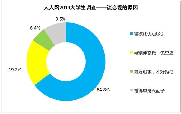 对于恋爱的原因,64.8%的学生称被彼此的优点吸引;19.3%的人希望寻找精神寄托,避免内心空虚;6.4%的人称对方强烈追求,不好意思拒绝;另有9.5%的人谈恋爱是因为觉得身边朋友同学都在谈恋爱,自己如果一直单身会很没面子。