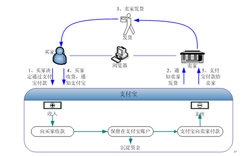 以支付宝支付模式为例,其具体运行流程是:
