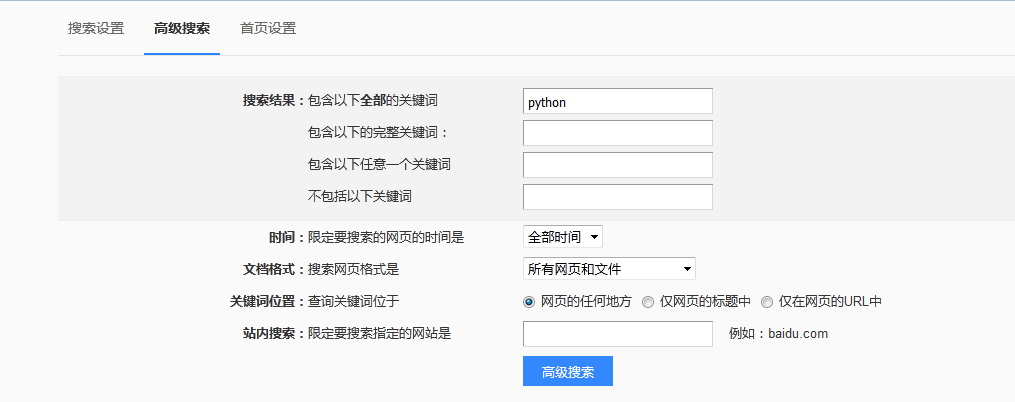 先展示百度的高级搜索页面,仅供参考: