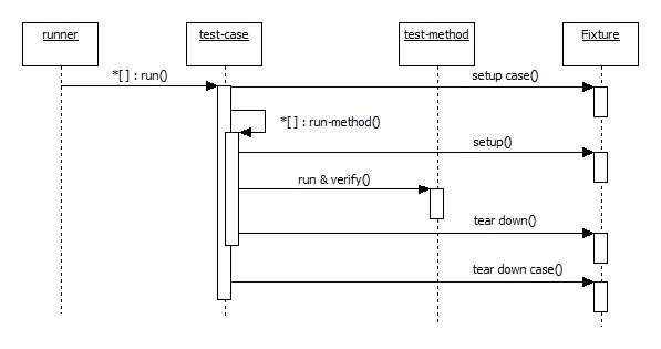 测试框架的序列图如上,其中Fixture是需要用户定制的测试场景,简单的情况是场景中只有待测系统SUT,而且不需要设置,例如测试一个函数时的情况。