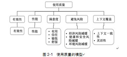 对质量的具体要求,可以参考国际标准ISO/IEC 25030的相关描述,质量不仅局限于终用户的需求(通常指外部质量要求、软件使用质量),还要考虑产品或项目的干系人(Stakeholders)的质量要求,包括组织的管理层、系统运维等,对软件内部质量也有具体要求,包括软件的可维护性、可扩充性等。从质量来看,用户的需求会显得更重要,我们会在使用质量(Quality in Use)上有更多的关注,使用质量的具体要求见图2-1。