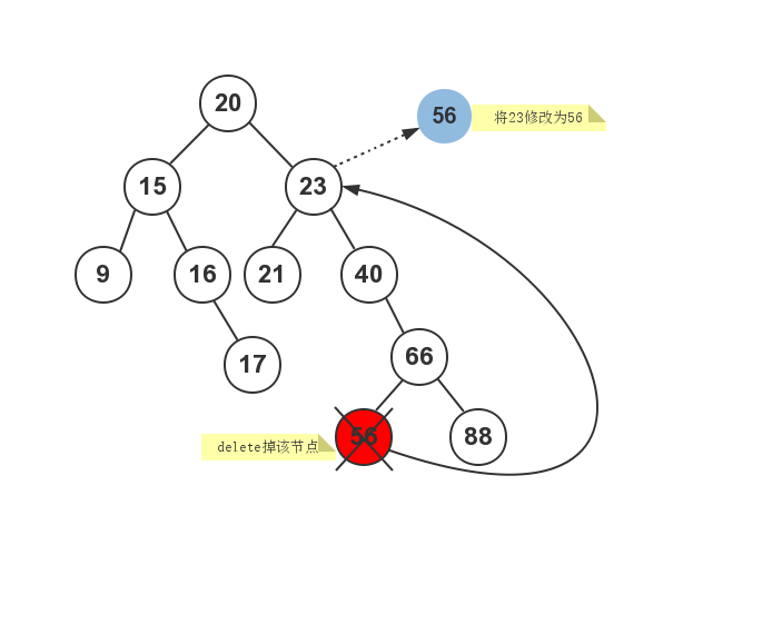假如现在需要删除包含值23的节点,步骤如下图所示: