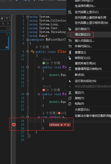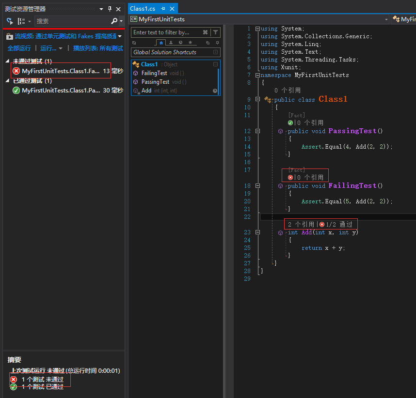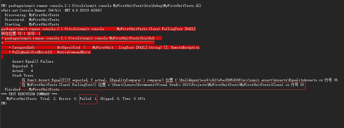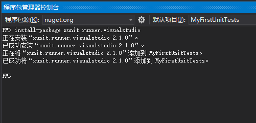 (要记得先编译哦)执行测试,在控制台输入命令packagesxunit.runner.console.2.1.0 oolsxunit.console MyFirstUnitTestsinDebugMyFirstUnitTests.dll