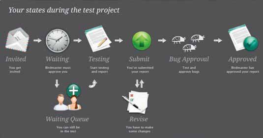 基于群体的测试的流程始于一个用项目经理和客户定义测试条件的简要介绍。这个流程包括概述项目(bug测试和/或可用性测试或组合测试),目标群体及其设备的重点。通过一个在线平台上的详细用户配置文件,参数是指定的且合适的测试人员可以被挑选来测试相应的软件。由于测试人员是在自己的环境中自己的设备上且思想开明,所以这些都是和一名应用程序开发人员进行内部测试时不一样的特点。群体给出过程描述,截图或截屏形式的反馈。然后这再由项目经理进行评估,并总结到建议付诸实践的终报告(和缺陷导出文件)中。