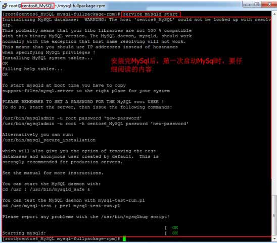 下图是第一次启动MySql服务器时的一些信息,该信息比较重要,要仔细阅读。