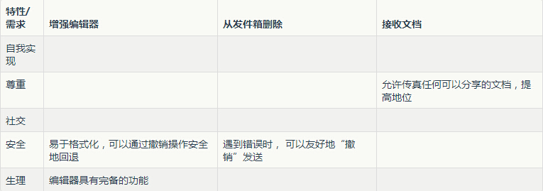 表1显示,接收其它应用发送的文档满足了高级的需求,使用户可以做没有这项功能无法做的事。这也许还能提高用户的地位(我能做某件事,而你不能)。这两种能力都可以满足人的尊重需求。根据表1中列出的特性能力,作为产品经理,你可能会赋予“接收文档”高的优先级,“增强编辑器”次之,而“从发件箱删除”是第三个有价值的特性。虽然“增强编辑器”和“从发件箱删除”均满足安全需求,但因为“增强编辑器”额外满足了生理需求,而“从发件箱删除”仅能满足安全需求,所以“增强编辑器”比“从发件箱删除”更有价值。在排定待办事项列表中特性的优先级时,作为产品经理,你的工作是根据马斯洛的需求层次理论,考虑待办事项列表中的特性如何满足用户的需求。在更低级的需求充分满足的情况下,总是为满足高级需求的特性赋予高的优先级。