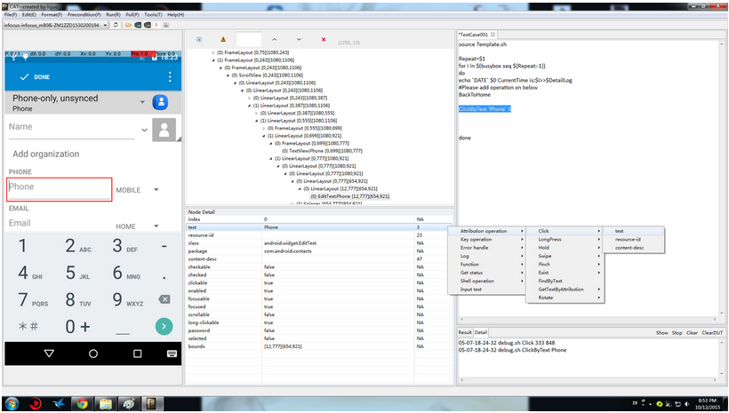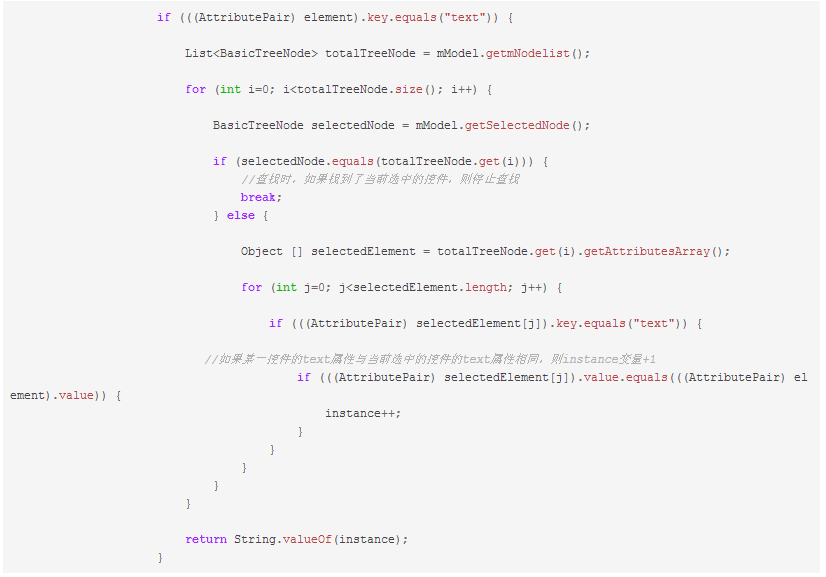 开始我默认是点击instance为1的控件,后台在开会时,同事问我,是否可以自动抓到第几个控件,比如在上图中,我们看到当前选中的是第三个text属性为Phone的控件,工具会在选择Attribution operation > Click > text之后,自动点击text属性为Phone的第三个控件,并刷新点击操作后的屏幕与控件信息到工具上来,我在uiautomatorviewer的源码uiautomatorviewer.java中加入了一列,用来显示text,resource-id及content-desc是第几个,这里是判断text属性是第几个控件的代码,