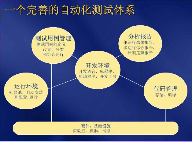 一个完善的自动化测试体系应该包含:硬件基础设施,运行环境,测试用例管理,开发环境,分析报告,测试/开发代码管理