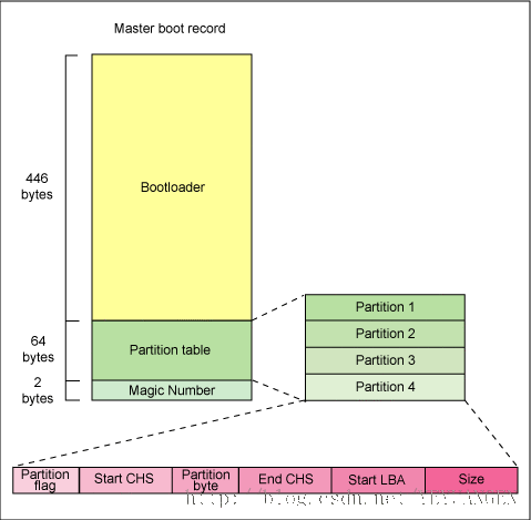 MBR 中的主引导载入程序是一个 512 字节大小的映像,当中包括程序代码和一个小分区表(?见图 2)。前 446 个字节是主引导载入程序,当中包括可运行代码和错误消息文本。接下来的 64 个字节是分区表,当中包括 4 个分区的记录(每一个记录的大小是 16 个字节)。