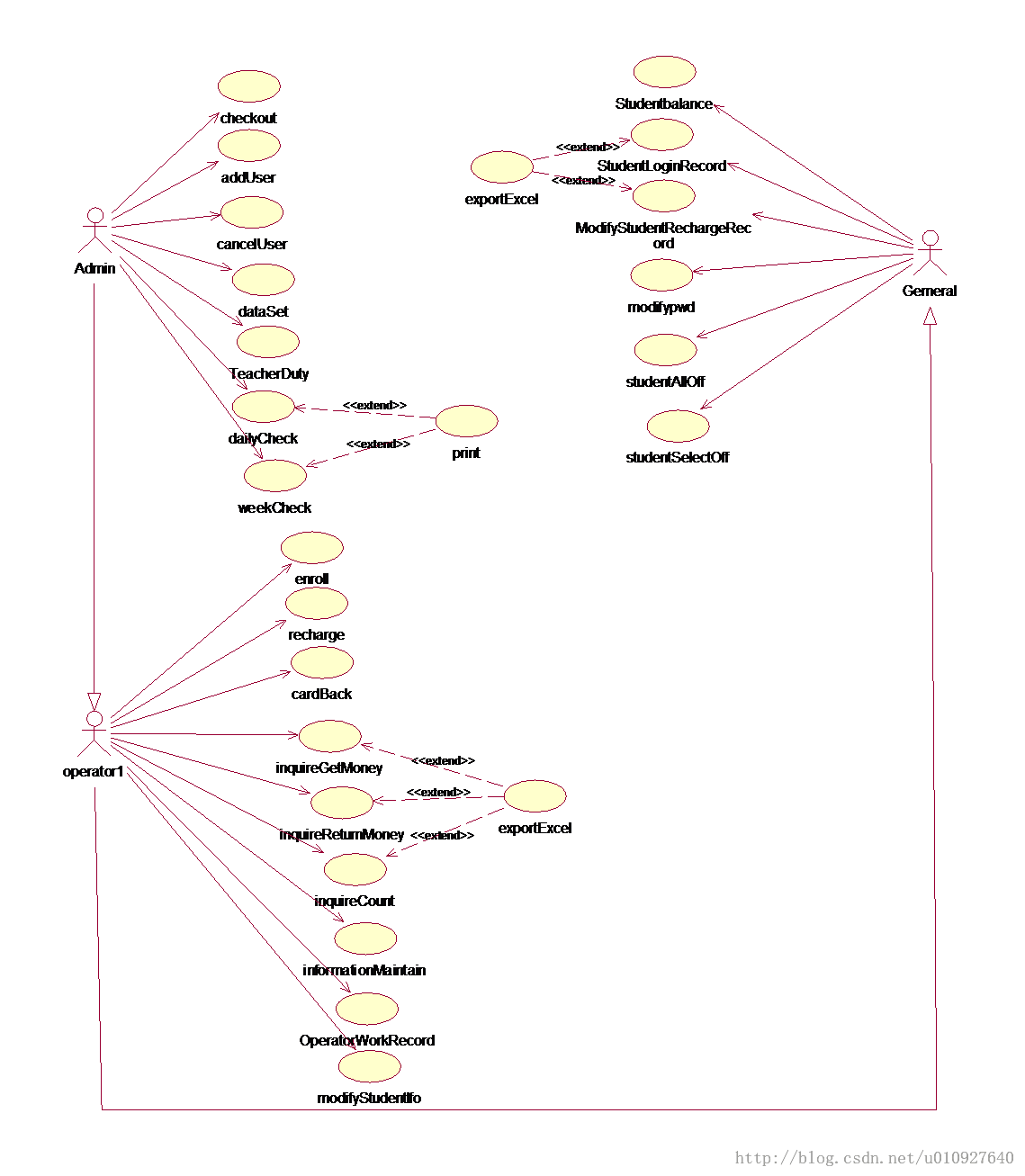 关于UML十种图,已在UML基本构造块之十种图中介绍,在此不重述了。我画的第一个图是用例图,画用例图的关键是找用例及其它们之间的关系,还有是抽象出参与者,当然参与者不仅仅是指人,还可以是系统、子系统或外部实体。一下是我画机房收费系统的用例图,用例我是根据系统的功能来画的,若有不正确的地方,望读者多多指正。