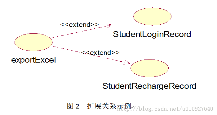 在图2中,基础用例是“StudentLoginRecord”(学生查看上机记录)和“StudentRechargeRecord”(学生查看充值记录),扩展用例是“exportExcel”(导出为excel表),在一般情况下,只要执行学生学生查看上机记录和学生查看充值记录用例即可。但如果学生想做成excel表打印出来,这时不能执行用例的常规操作,如果去修改“StudentLoginRecord”和“StudentRechargeRecord”用例,势必增加系统的复杂性。这时可以在这两个用例中插入一个用例,这样在学生想在查看之后导出为excel表,可直接执行扩展用例“exportExcel”。