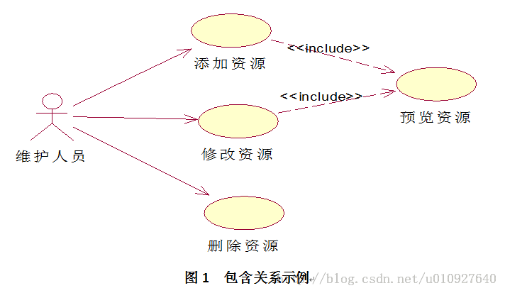 从图1(为方读者理解,用了中文命名用例)中可看出添加和修改资源都抽象出来一段行为,成为一个新的用例——预览资源。而原有的添加和修改资源这两个用例都会包含这个新抽象出来的资源。这样做的好处是,以后如果对预览资源进行修改,则不会影响到添加和修改资源这两个用例,也不会发生描述不一致的情况,因为只是在一个用例中进行修改。