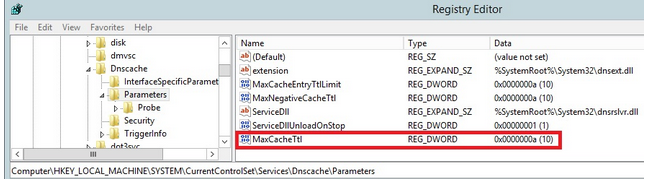 打开注册表:HKEY_LOCAL_MACHINESYSTEMCurrentControlSetservicesDnscacheParameters
