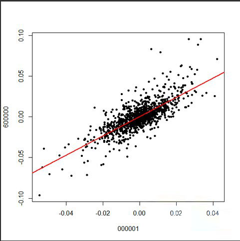 后借助RODBC包把Oracle和R连接起来,给出一个数据分析的例子,计算一下浦发银行600000和上证指数000001之间的线性关系,R代码如下,