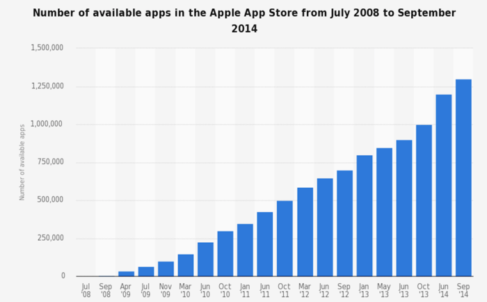什么叫做爆发式的增长呢?我们先来看看数据。根据维基百科上的资料,截至到2014年8月,GooglePlay上的应用数量在130万以上;过了一个月后,App Store的应用数量同样超过了130万款。由于Google Play和App Store分别是在2013年7月和2013年10月累积到100万款应用的,所以你可以看到这一年左右的时间里,两者的应用增长数量都在30万款以上,这也意味着平均每天都有800多款新app出现。