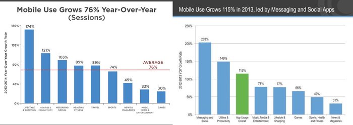 首先我们还是来看数据,根据移动数据分析公司Flurry的数据,2014年的移动应用使用量同比增长76%,而2013年这个数字是115%。(Flurry对“使用”定义是,用户打开app,并且记录一次“会话”。)