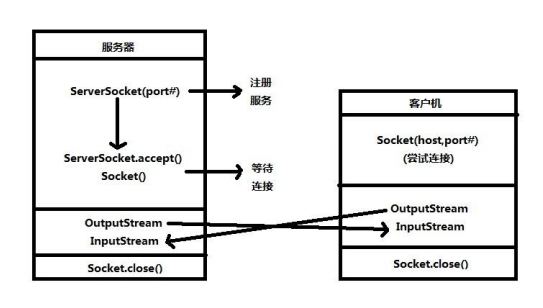 在 Java 中,TCP/IP 接口的连接是由 java.net 包中的类实现的。如图表示的是 Socket 连接过程中客户端和服务器端的工作原理。