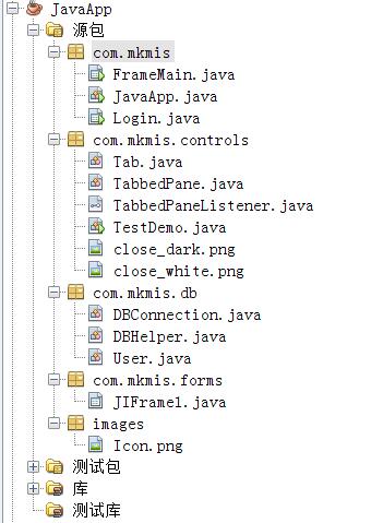 新建一个java应用程序JavaApp,并创建相关的包及文件,其中简单实现了一个登录界面(JDBC 访问MYSQL数据库),登录成功后跳转到主界面.在主界面上单击菜单,可以打开子窗体.java swing自带的JTabbedPane没有显示关闭按钮的功能,这里在com.mkmis.controls包下自定义了一个TabbedPane控件,可以实现带关闭按钮的页签面板.应用结构如下图所示: