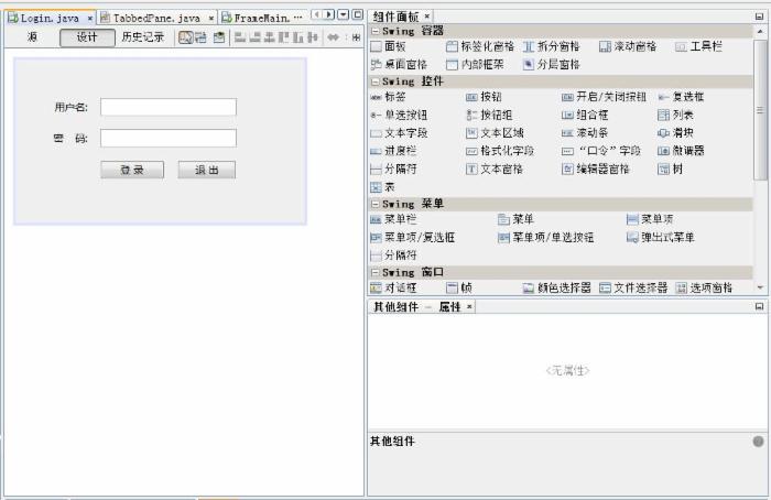 在IDE中新建一个Login的JFrame窗体,单击[设计]视图,可以将组件面板中的相关控件拖放到界面上,和Vistual Studio的操作差别不大,是界面显示效果较差,不及Vistual Studio.用户名文本框用的文本字段,密码框用的是口令字段控件.登录和退出按钮用的是按钮控件.