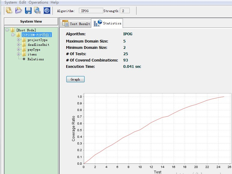 当然我们是理性的人,不是人傻时间多。我们可以使用ACTS工具,该工具很牛叉,使用的是IPOG算法。通过该工具我们可以得到优的25个用例,如下: