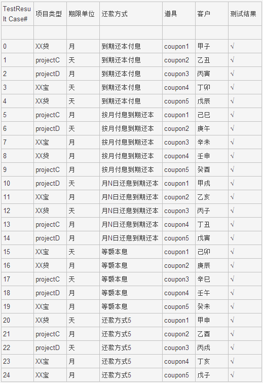 后,这25个投资用户与25个项目对号入座,意思是用户甲子使用道具投资XX贷的这个项目,过程中我们将检验各种流水,得出一个这样的测试结果: