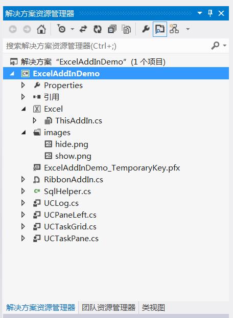 用Visual Studio 2012新建一个ExcelAddInDemo的Excel Add-In项目,并添加若干文件,程序结构如下图: