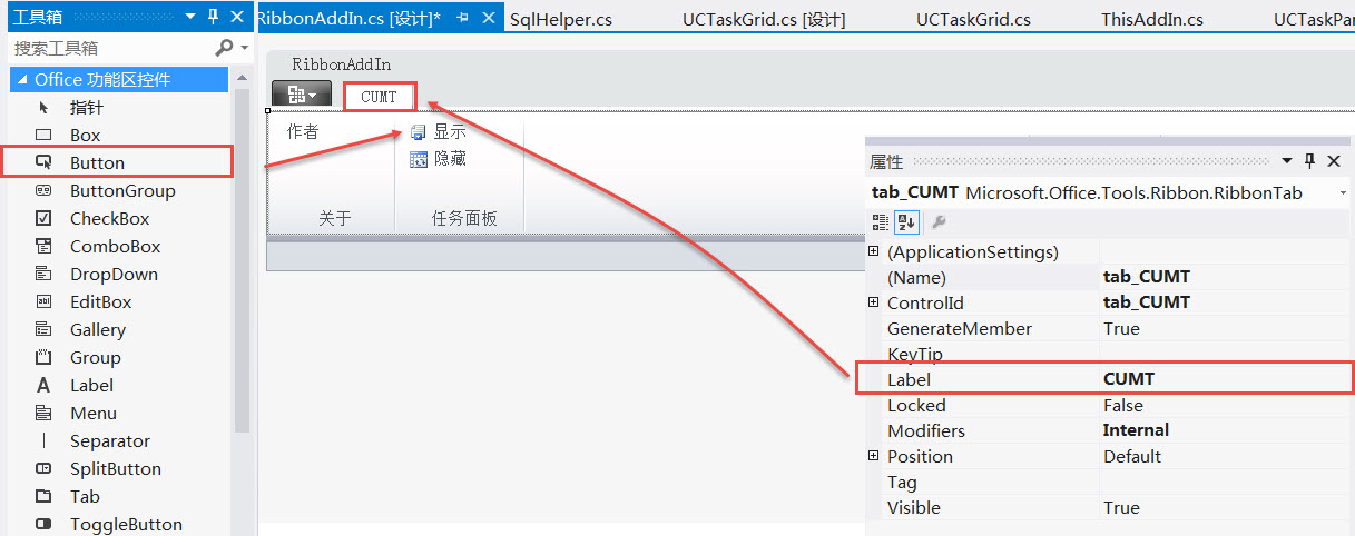 我们通过RibbonAddIn.cs给Excel的Ribbon添加了一个名为CUMT的插件.RibbonAddIn面板可以通过工具条控件方便的拖放到设计界面上.RibbonAddIn.cs的属性设置如下图所示: