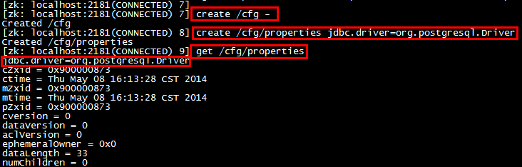 如图所示:我创建了一个节点 /cfg/properties 并设置内容为:jdbc.driver=org.postgresql.Driver