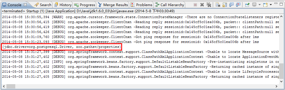 OK 了,zoo.paths是本地application.properties文件中的,jdbc.driver是远程ZooKeeper服务器中的。