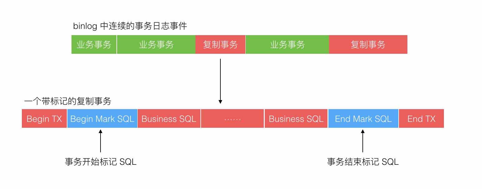 从 MySQL 自身的方案中可以找到切入点,是如果能在 binlog 中打上标记,有办法判断哪些 binlog 是复制产生的,并将其过滤。使用 MySQL 的方案则过于耦合 MySQL 的配置,在大规模部署的线上生产系统中容易因为 MySQL 配置错误导致问题。