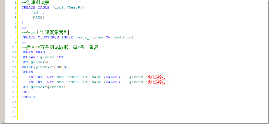 下面我们进行测试,创建一个测试表,创建聚集索引。插入10万条测试数据,其中每2条一重复,如图2所示。