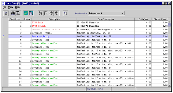 (4)执行追踪分析(TRACE):CODETEST 可以按源程序,控制流以及高级模式来追踪嵌入式软件。提供400K 的追踪缓冲空间,大追踪深度可达150 万条源级程序,其中高级追踪模式显示的是RTOS 的事件和函数的进入退出,给测试者一个程序流程的大框图;控制流追踪增加了可执行函数中每一条分支语句的显示;源级追踪则又增加了对被执行的全部语句的显示。在以上三种模式下,均会显示详细的内存分配情况,包括在那个代码文件的那一行,那一个函数调用了内存的分配或释放函数,被分配的内存的大小和指针,被释放的内存的指针,出现的内存错误。