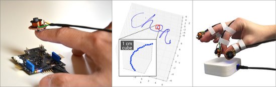12月23日消息,据Engadget网站报道,在理想世界里,你可以像在现实生活中一样,用手抓住虚拟现实里的物体。但现实往往并非如此,除了使用专门的手套,你一般只能使用抽象的控制器。然而,近期Oculus和美国华盛顿大学的研究人员或可能将它变为现实。他们研发出一种名为Finexus的控制方法,后者结合使用了指尖电磁体和传感器来追踪你的手。这个系统会检测每根手指和传感器指尖的距离,使用每个距离的交叉点来确定一个给定数字的精确3D位置。与照相机追踪不同,你不需要与传感器之间的直接视线——你甚至可以系上虚拟的鞋带。